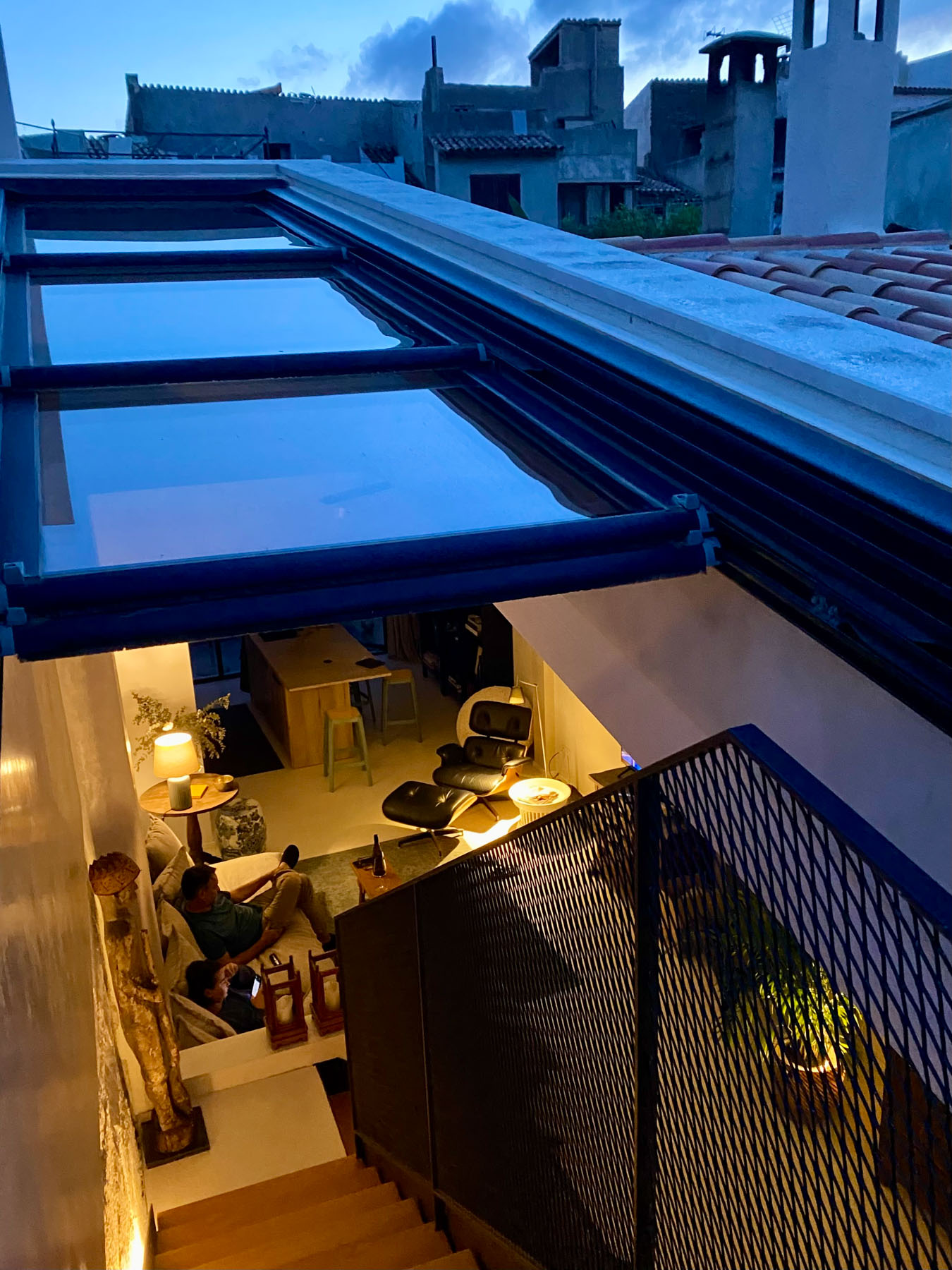 The actual living area of the house on the second floor houses the living room with stylish lounge furniture, TV and wood-burning stove as well as the modern yet cozy kitchen and dining area. Wooden beams adorn the high ceiling in this living area, while a sophisticated lighting concept provides direct and indirect lighting. A glass roof, which can be opened automatically, provides additional daylight and underlines the open room concept. When the sliding glass roof is open, an elegant internal staircase leads to the spectacular roof terrace with all-round views of the surrounding rooftops and the castle. The modern fitted kitchen is stylishly designed and equipped with high-quality appliances. People eat, talk and laugh at the kitchen island…