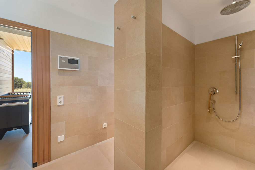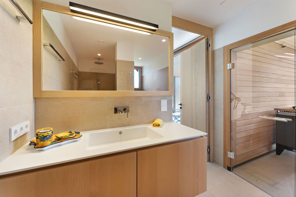 La zona de spa y fitness de alta calidad, con sauna, ducha y WC, tiene acceso directo a la cuidada zona ajardinada y acentúa el carácter de bienestar de la propiedad. La calefacción por suelo radiante y el aire acondicionado en los dormitorios y la cocina garantizan un ambiente acogedor durante todo el año.