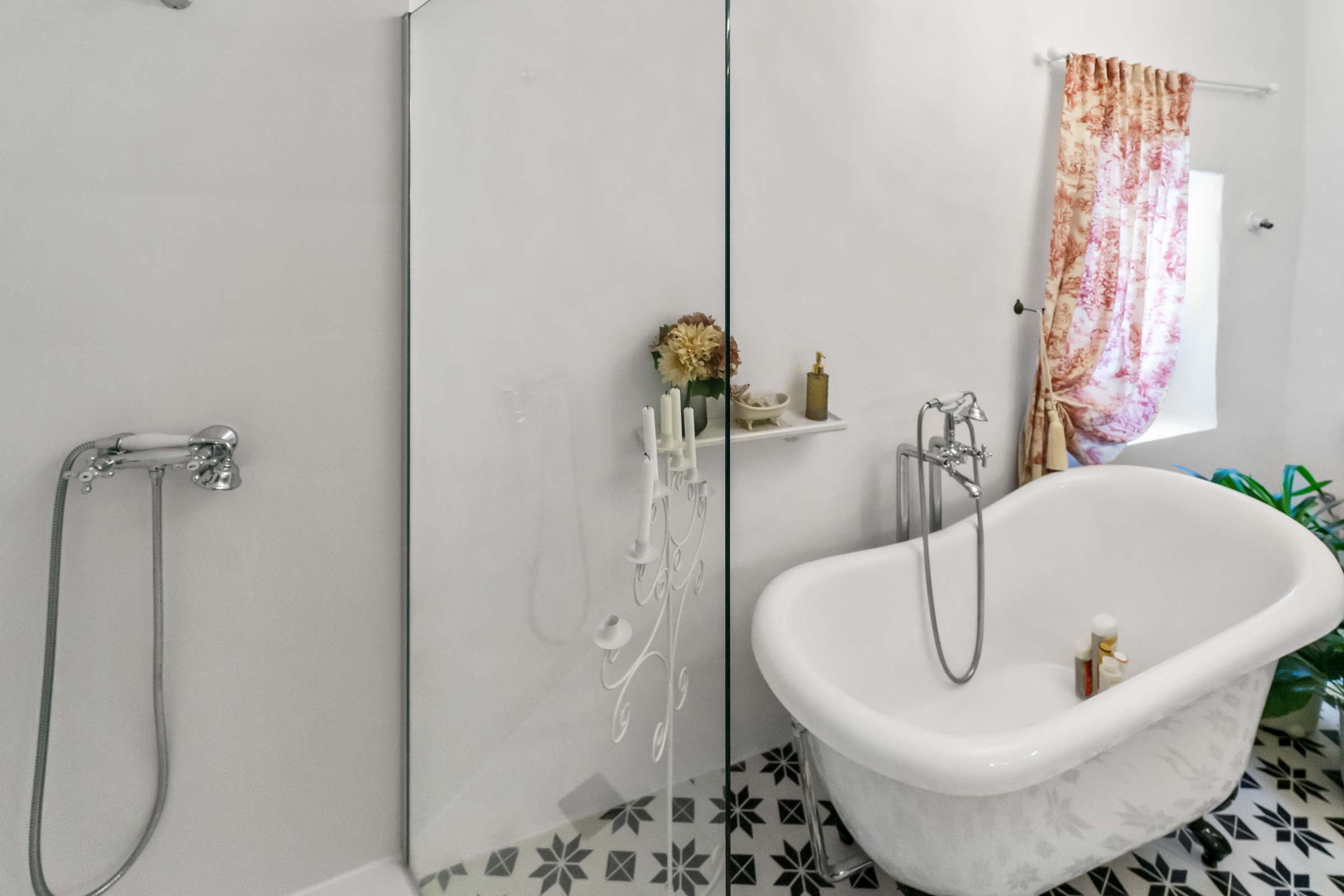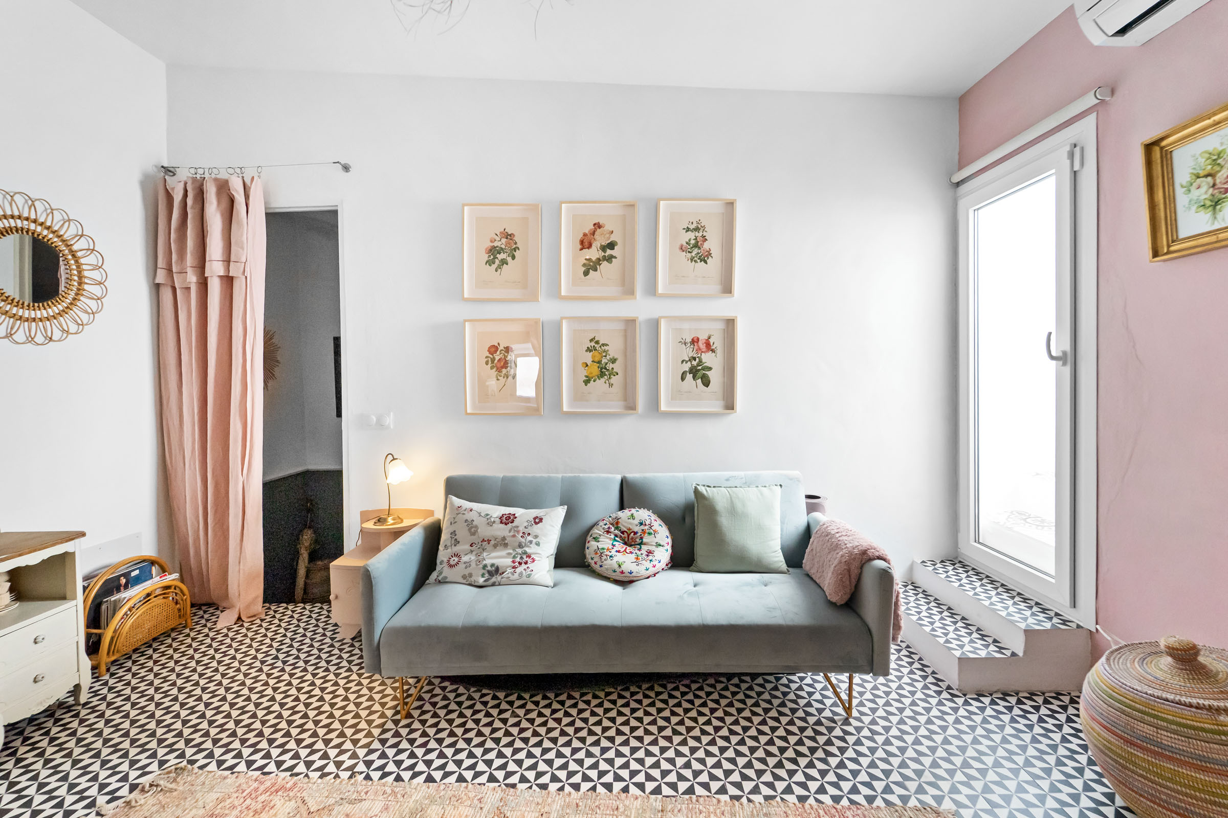 El pasillo continúa hasta el espacioso salón, que impresiona por su ambiente abierto pero acogedor. Aquí caben fácilmente un sofá, una mesa de centro, una zona multimedia y estanterías, sin restar ligereza a la estancia. Al lado hay un dormitorio con baño en suite, diseñado en un relajado estilo de inspiración francesa que desprende calma y sofisticación.