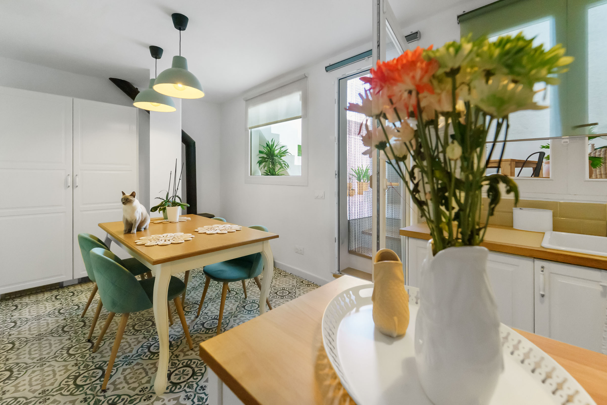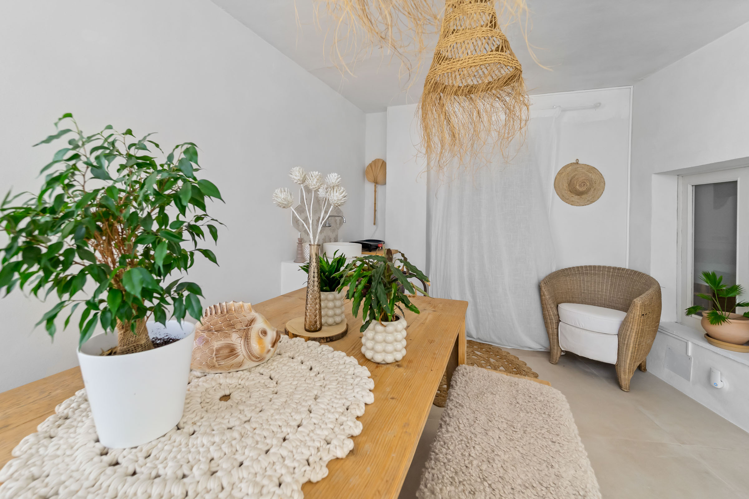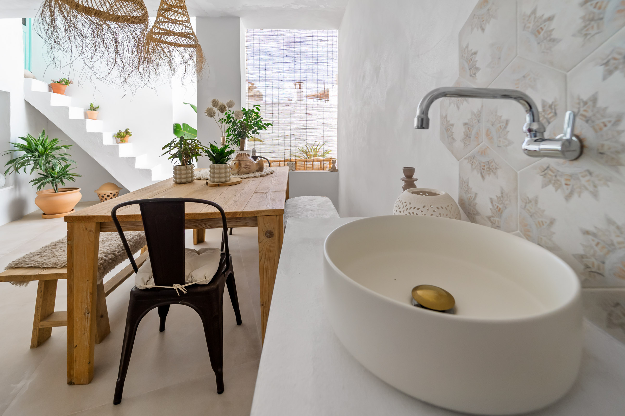 La cocina abierta con comedor integrado y chimenea se abre en la parte trasera de la casa. Esta estancia constituye el corazón de la casa y combina funcionalidad con una acogedora calidez. Desde aquí tienes acceso directo al encantador patio. Esta zona exterior ofrece tanto una soleada zona de solárium como un porche cubierto con zona de comedor y cocina exterior, ideal para largas veladas bajo el cielo mallorquín.