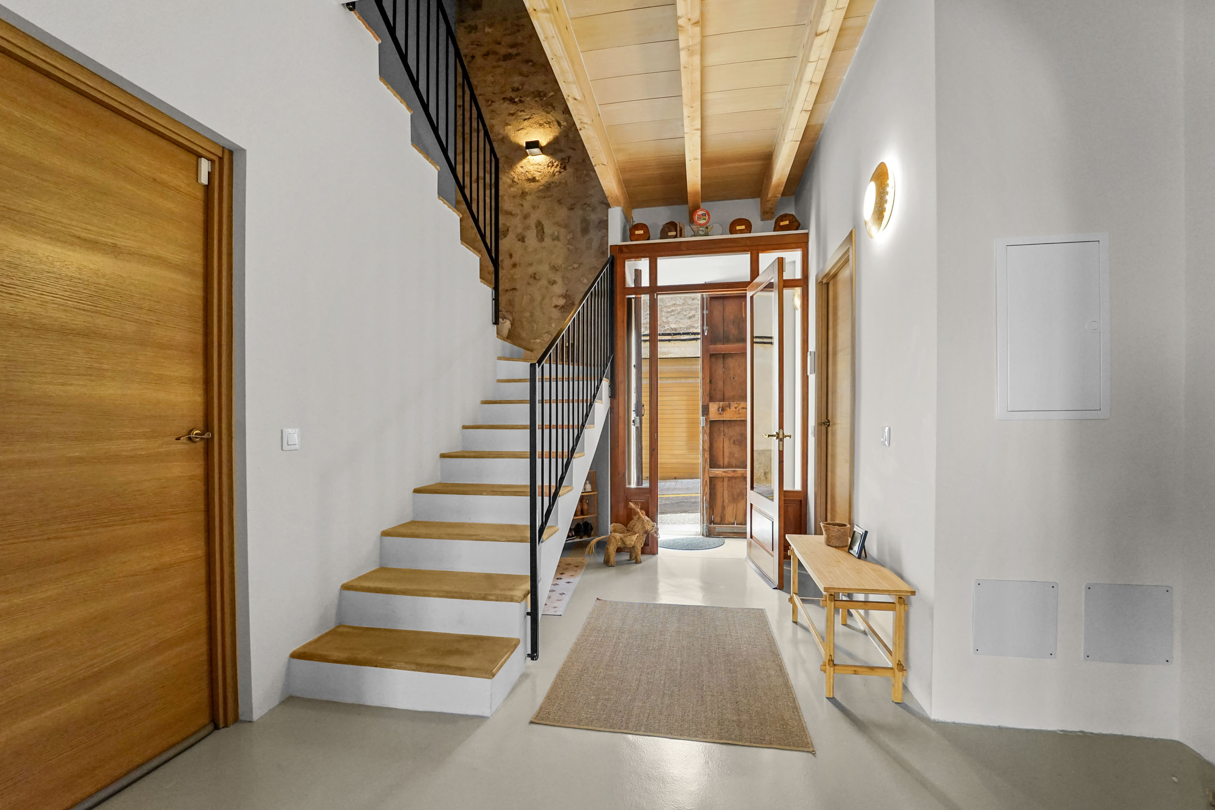 Entras en la casa por la puerta de entrada de madera original y un pequeño vestíbulo. Otra puerta de entrada totalmente aislada conduce a la elegante escalera residencial con aseo de invitados y acceso directo al espacioso garaje, que tiene una puerta eléctrica y una caja de pared para tu coche eléctrico.