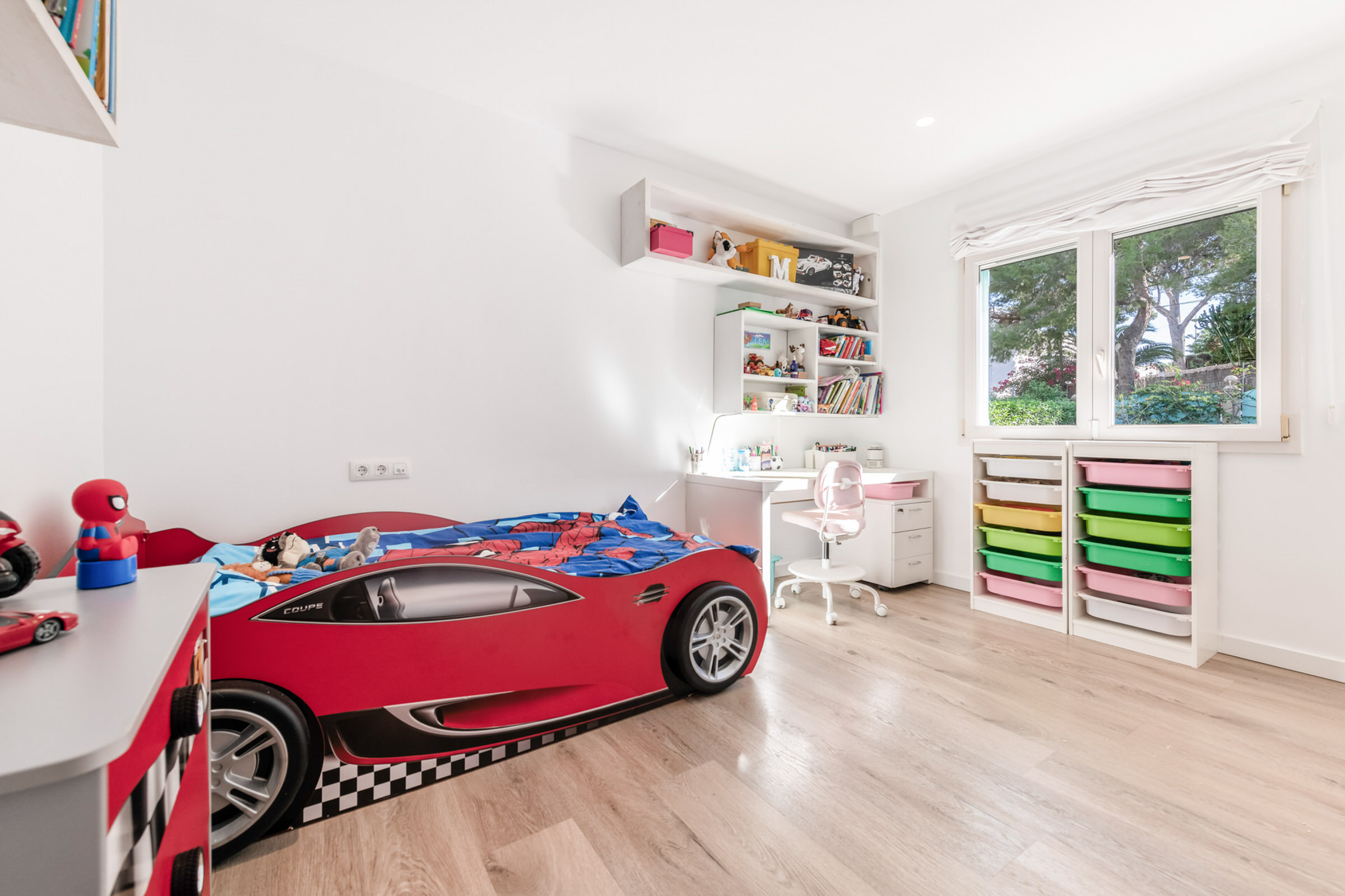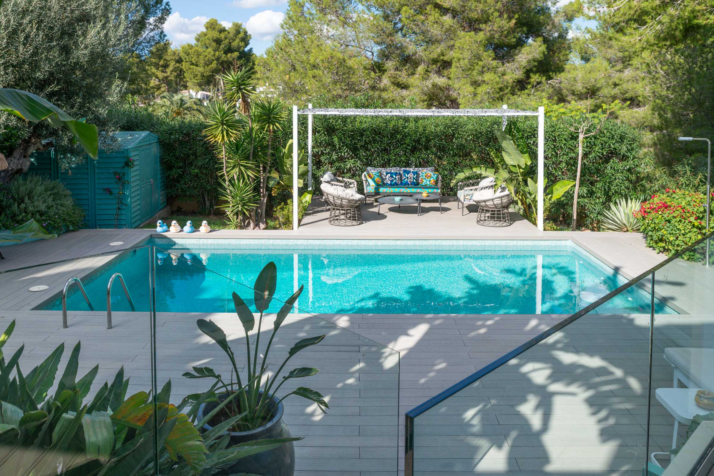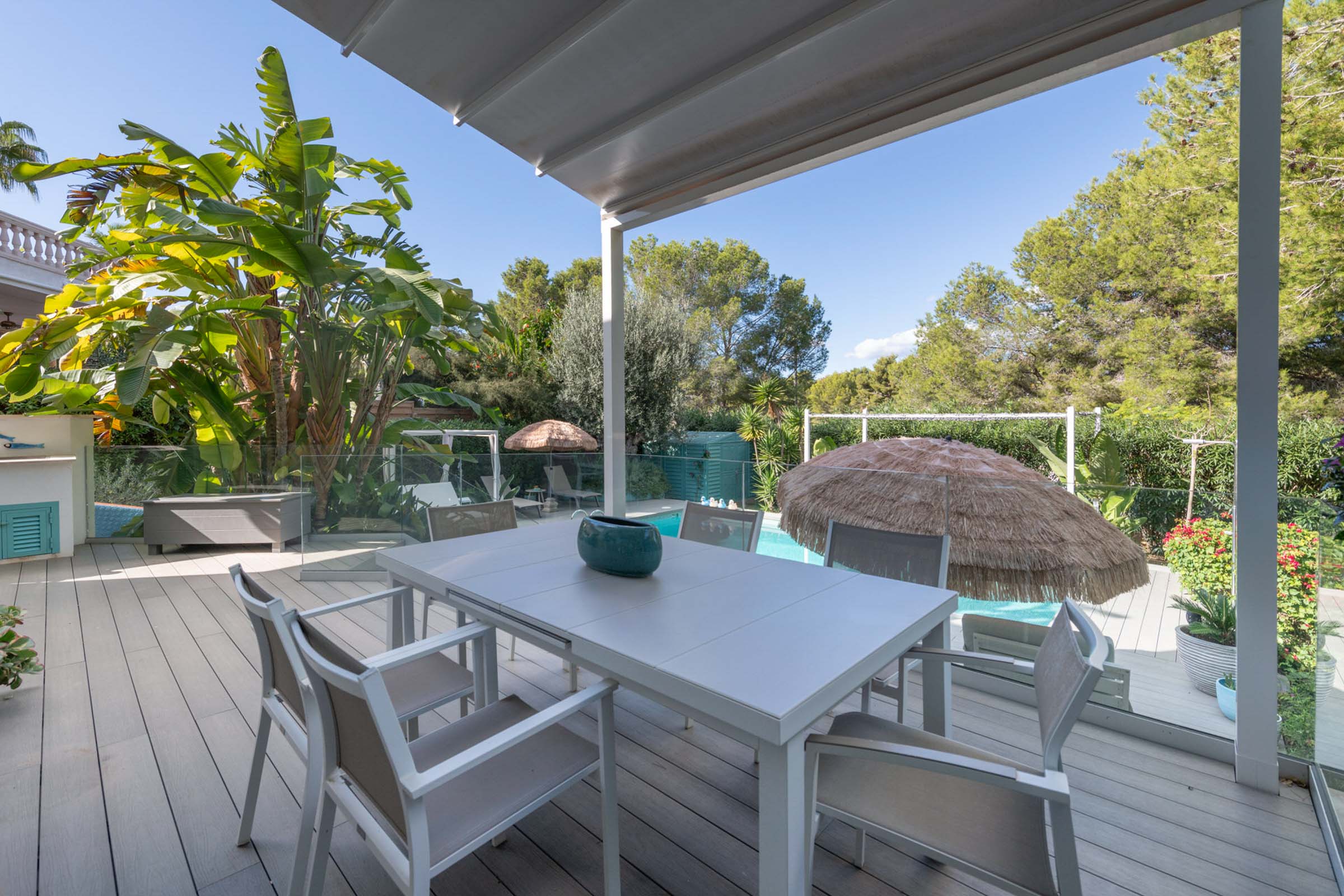 El cuidado jardín mediterráneo con amplia terraza, piscina privada y zona de barbacoa invita a relajarse y disfrutar, ideal para invitados y veladas sociables. Una plaza de aparcamiento completa la oferta.