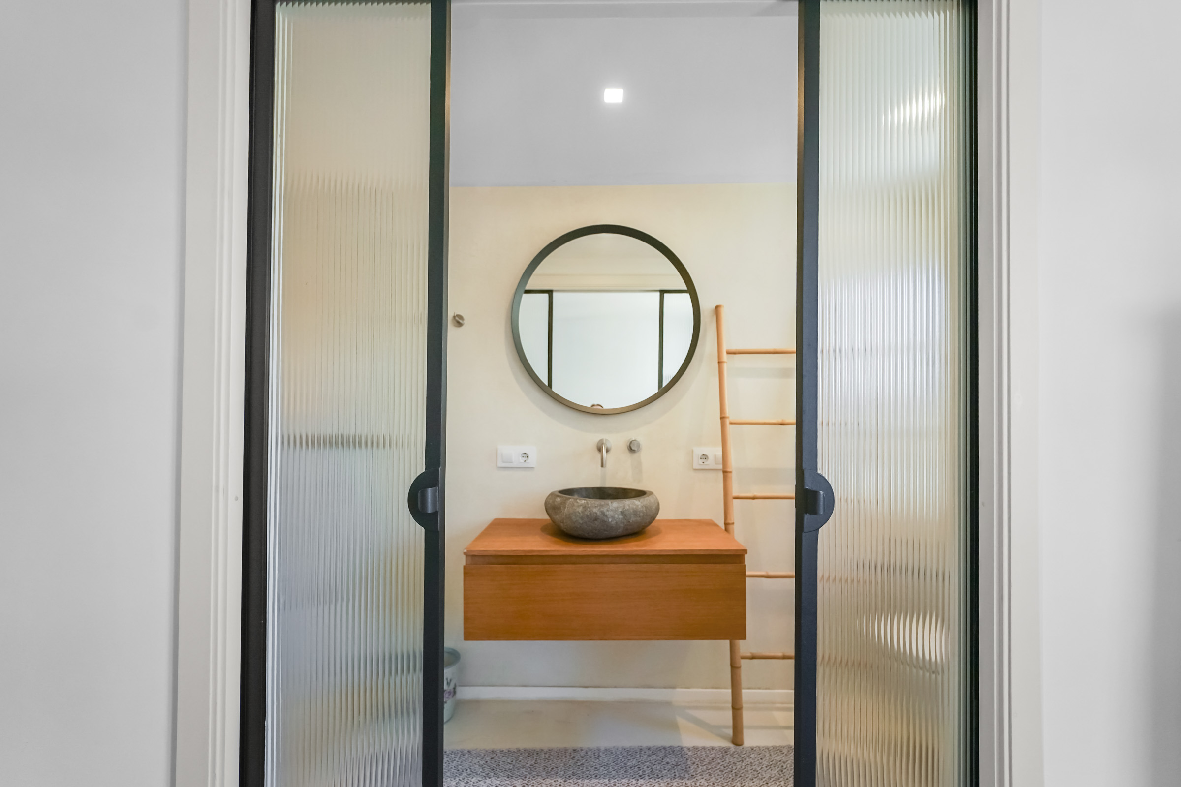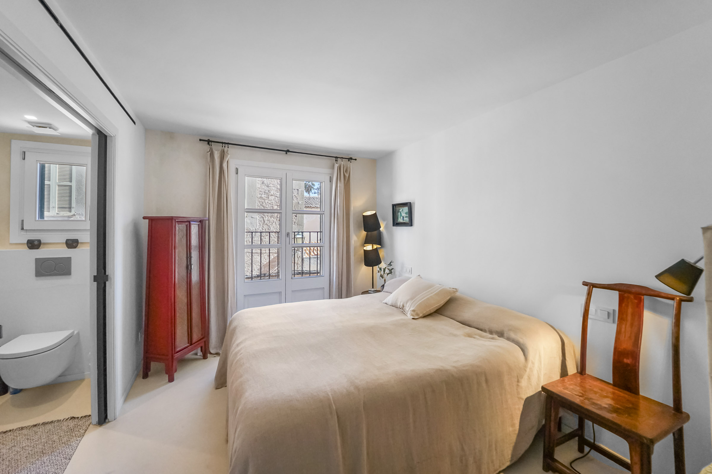 Es handelt sich um ein Domizil, das sowohl höchsten Wohnansprüchen genügt als auch viel Privatsphäre bietet: Verteilt auf drei Etagen und auf das Vorder- und ein Hinterhaus befinden sich drei schöne Schlafzimmer, jeweils mit Ensuite-Badezimmer, in denen moderne Bad-Armaturen und Natursteinbodenfliesen verbaut sind. Auch eine zweite Wohnküche gibt es, im hinteren Haus gelegen und erreichbar über die Freitreppe des Patios. Diese gemütliche Wohnküche mit vorgelagerter Terrasse eignet sich wunderbar für gesellige Sommerabende mit Freunden. An kühleren Abenden knistert das Feuer Kaminofen. Auf dem hinteren Haus gibt es eine zweite Dachterrasse.