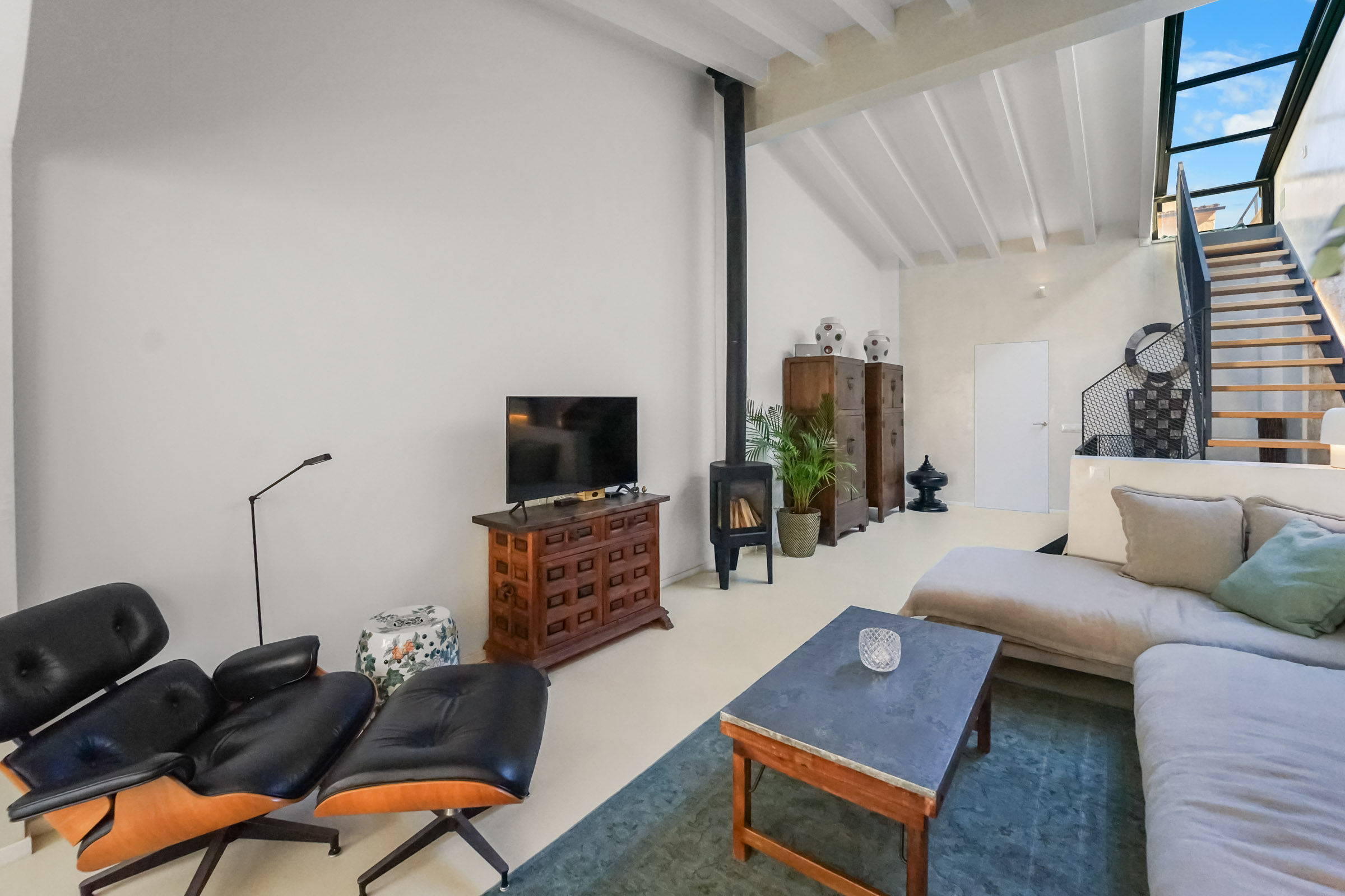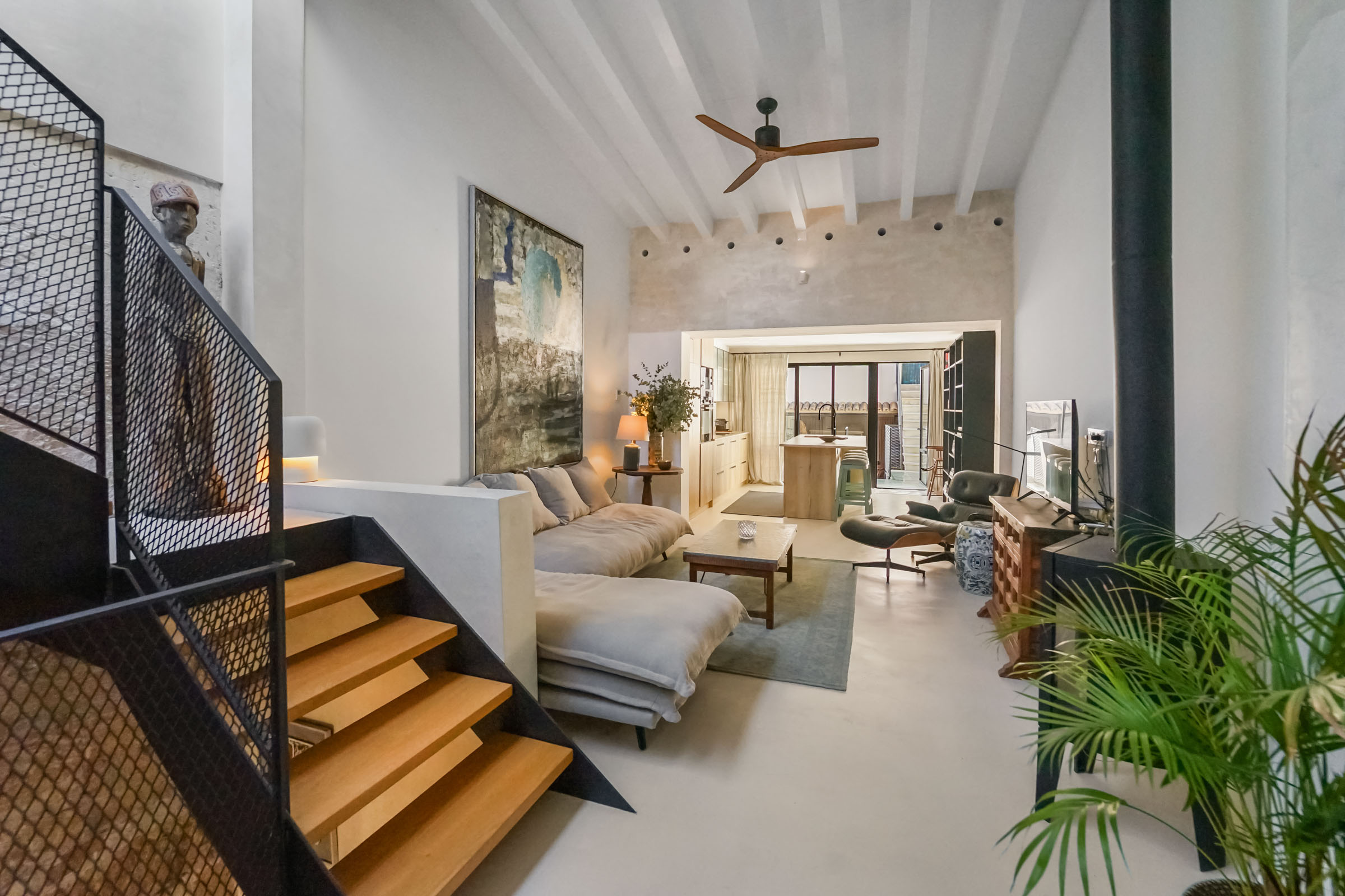 Das Wohnkonzept dieses Stadthauses mit Vorderhaus, Patio und Hinterhaus ist äußerst durchdacht und mit Liebe zum Detail umgesetzt: Alle 5 Wohnräume sind hell gestaltet, der zartgraue Mikrozementboden verleiht den Räumen eine besondere Eleganz. Raffinierte Innen- und Außentreppen verbinden die Etagen und setzen architektonische Akzente. Die bodentiefen Panoramafenster verfügen über Doppelverglasung und Sonnenschutz. Die zum Teil baulich integrierte Klimaanlage (warm/ kalt) und ein gusseiserner Kaminofen im Wohnzimmer schaffen zu jeder Jahreszeit eine angenehme Wohlfühl-Atmosphäre.