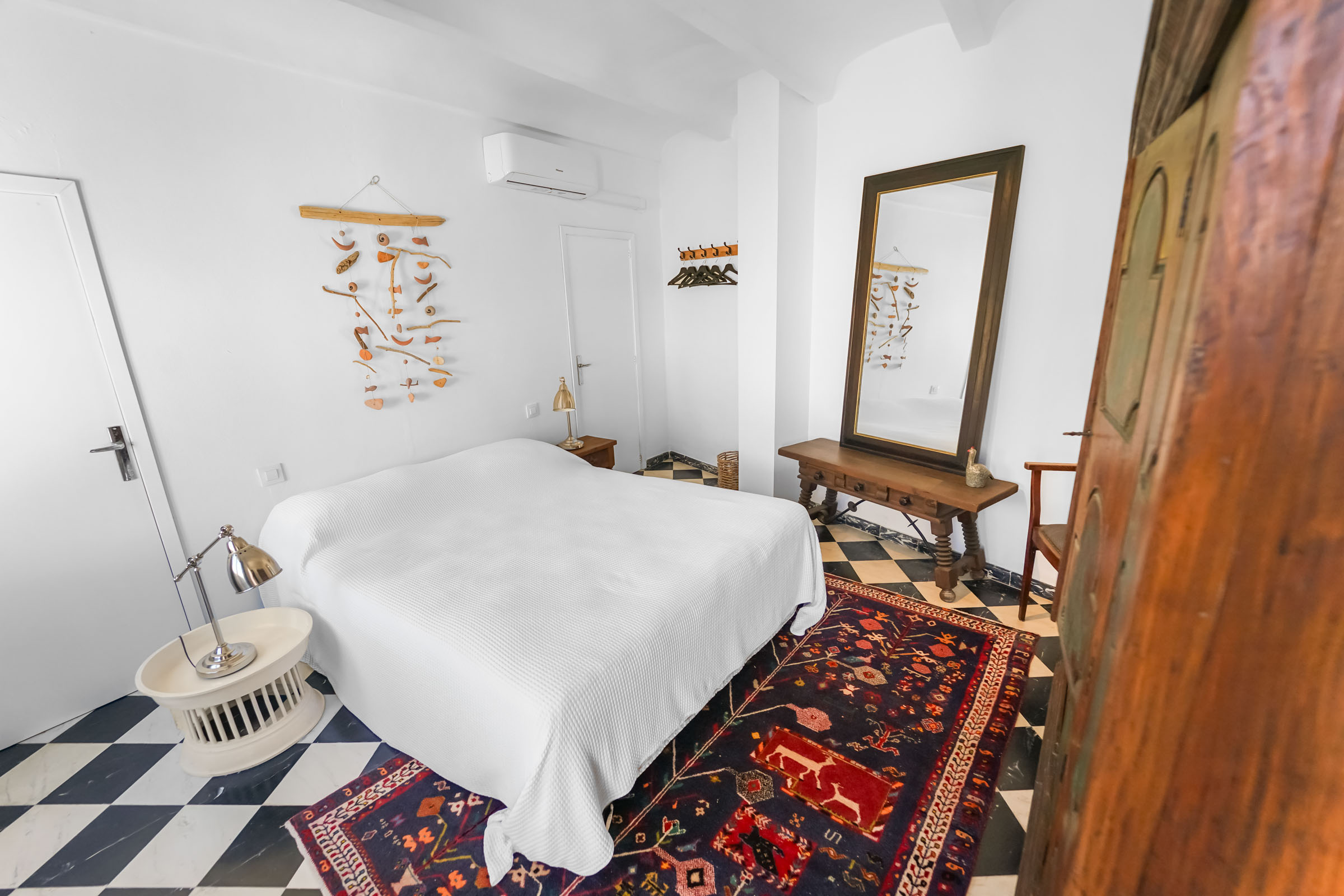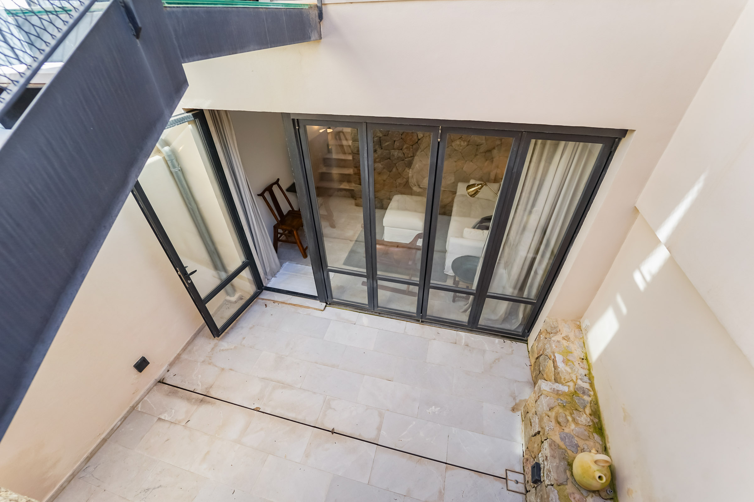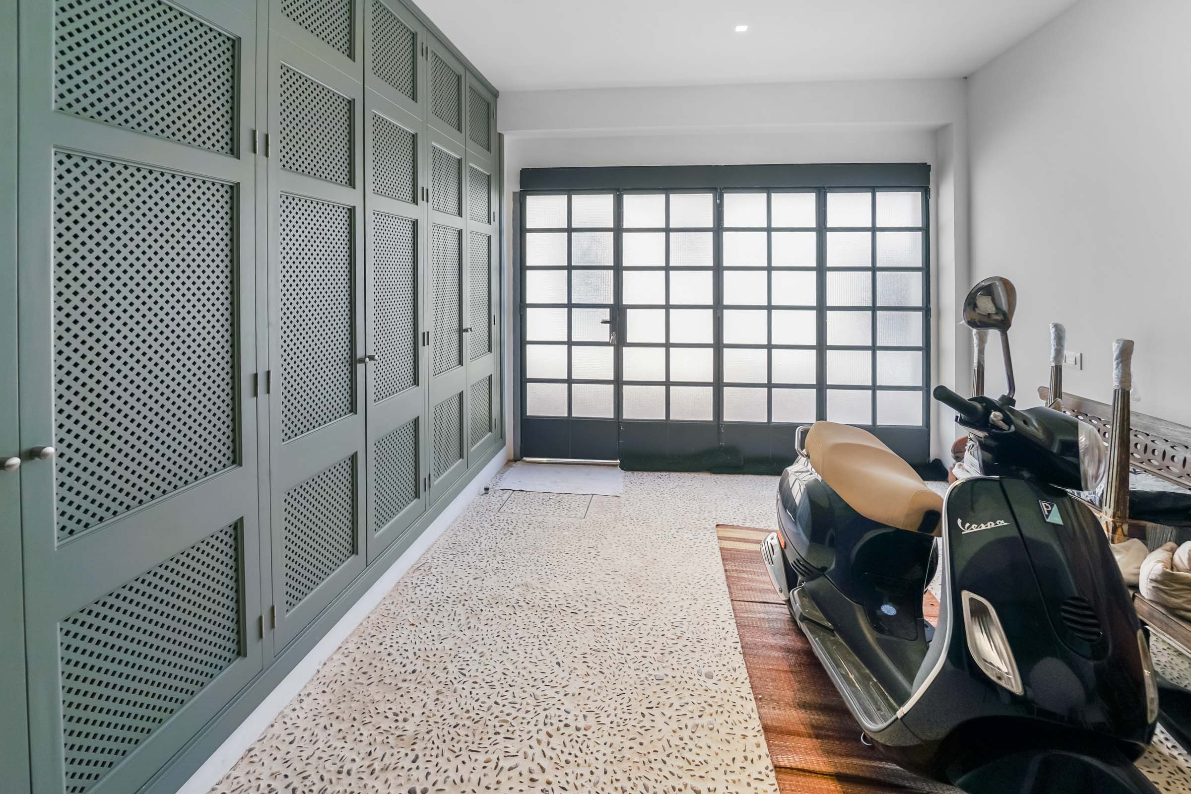 Der Eingangsbereich des Hauses mit gepflegtem Terrazzoboden und wohnlich gestaltet kann bei Bedarf als Stellplatz für ein Motorrad oder ein Auto genutzt werden. Im Erdgeschoss, angrenzend an das untere Wohn-/Schlafzimmer, befindet sich eine abgeschiedene Terrasse, die im Sommer Schutz vor der Hitze bietet.