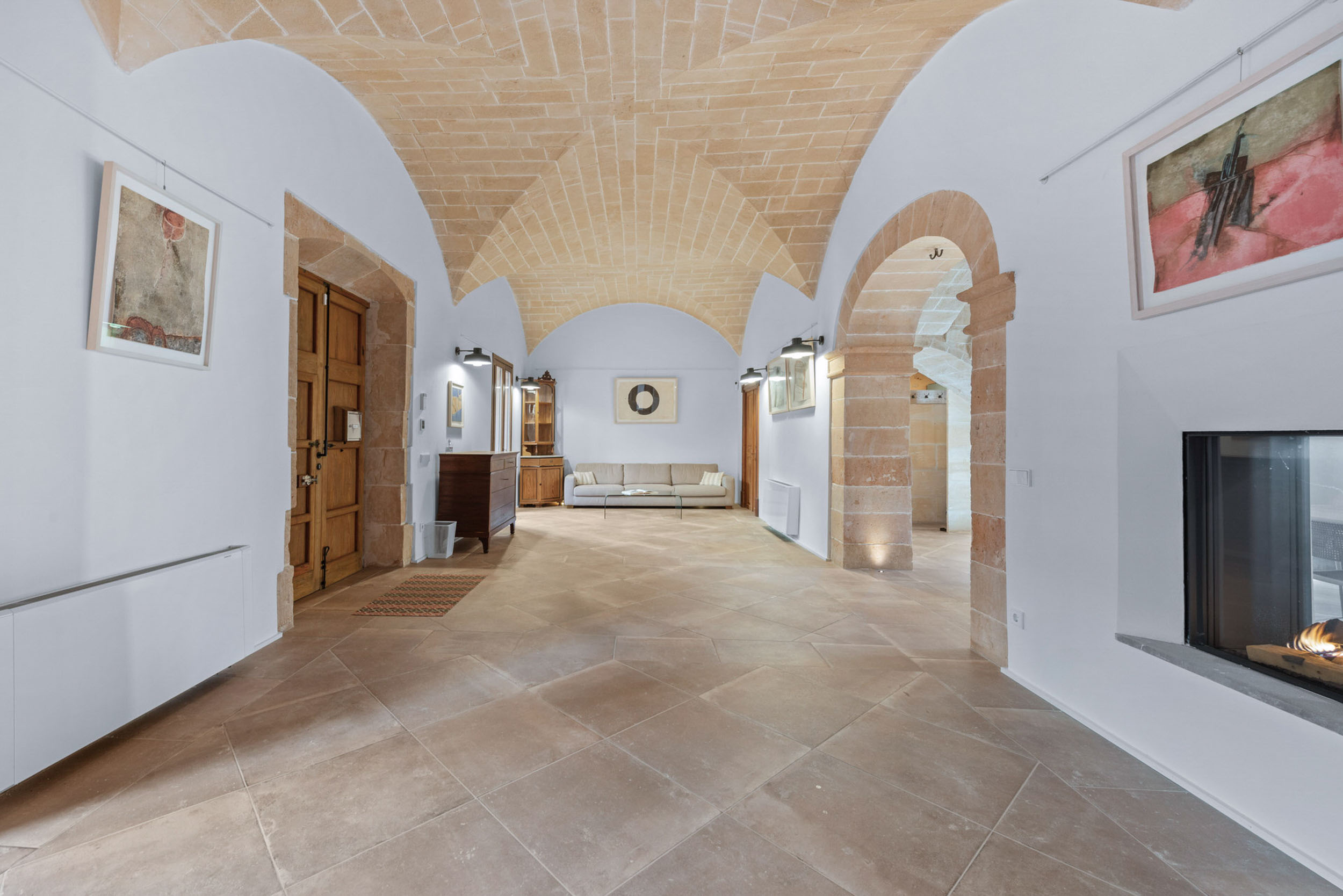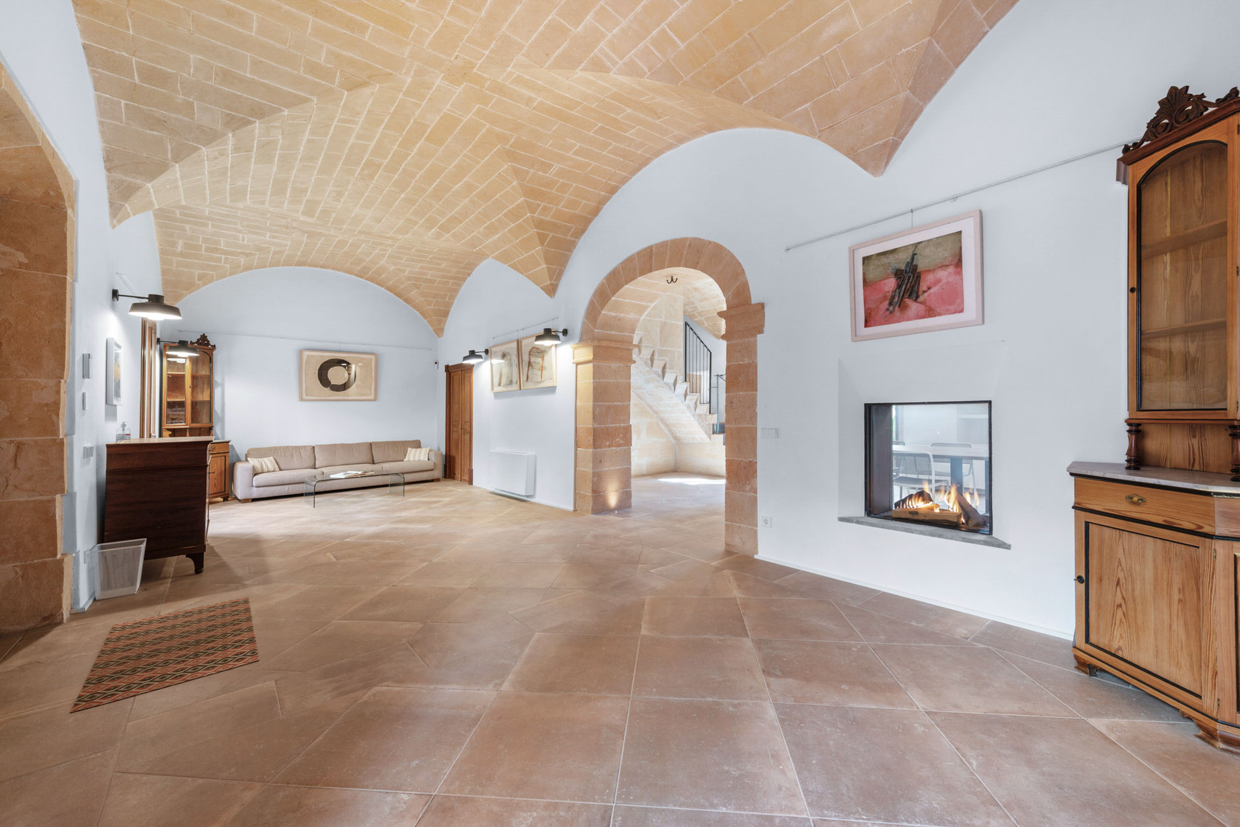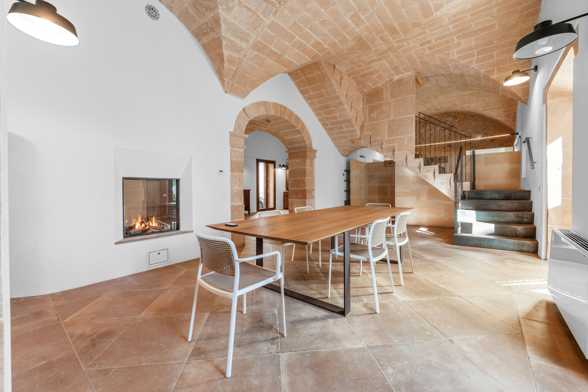 Im Erdgeschoss fügen sich ein vornehmer Wohn- und Essbereich harmonisch zusammen, verbunden durch einen eleganten architektonischen Bogen. Der Gaskamin verleiht dem Ambiente Wärme und Raffinesse, während das beeindruckende Kreuzgewölbe das Ensemble mit einer ausgeprägten mediterranen Identität unterstreicht. Der von natürlichem Licht durchflutete Innenhof wird zum Herzstück des Hauses und sorgt für Weite und ein angenehmes Gefühl der Ruhe.