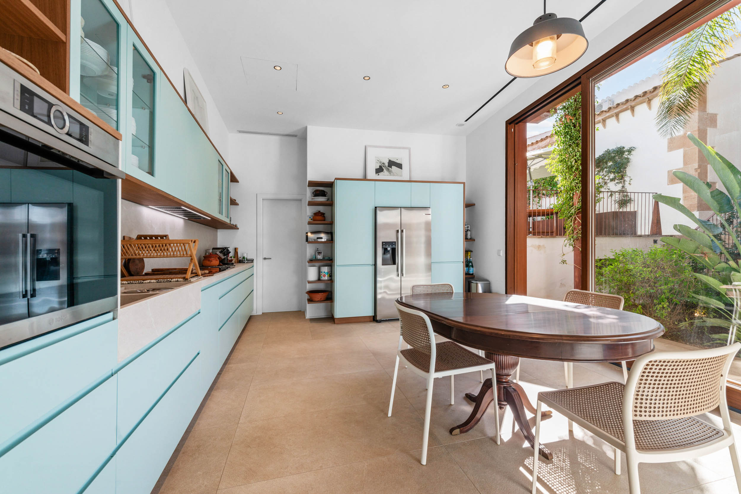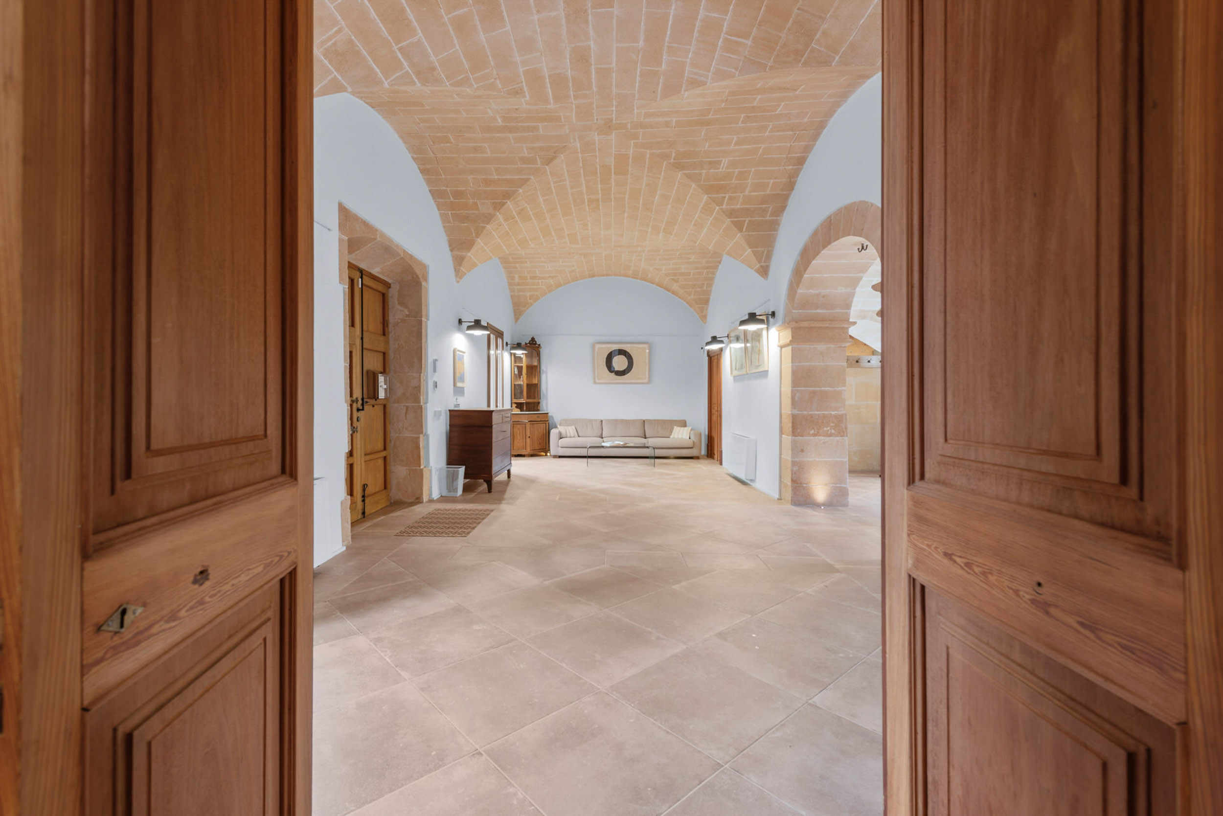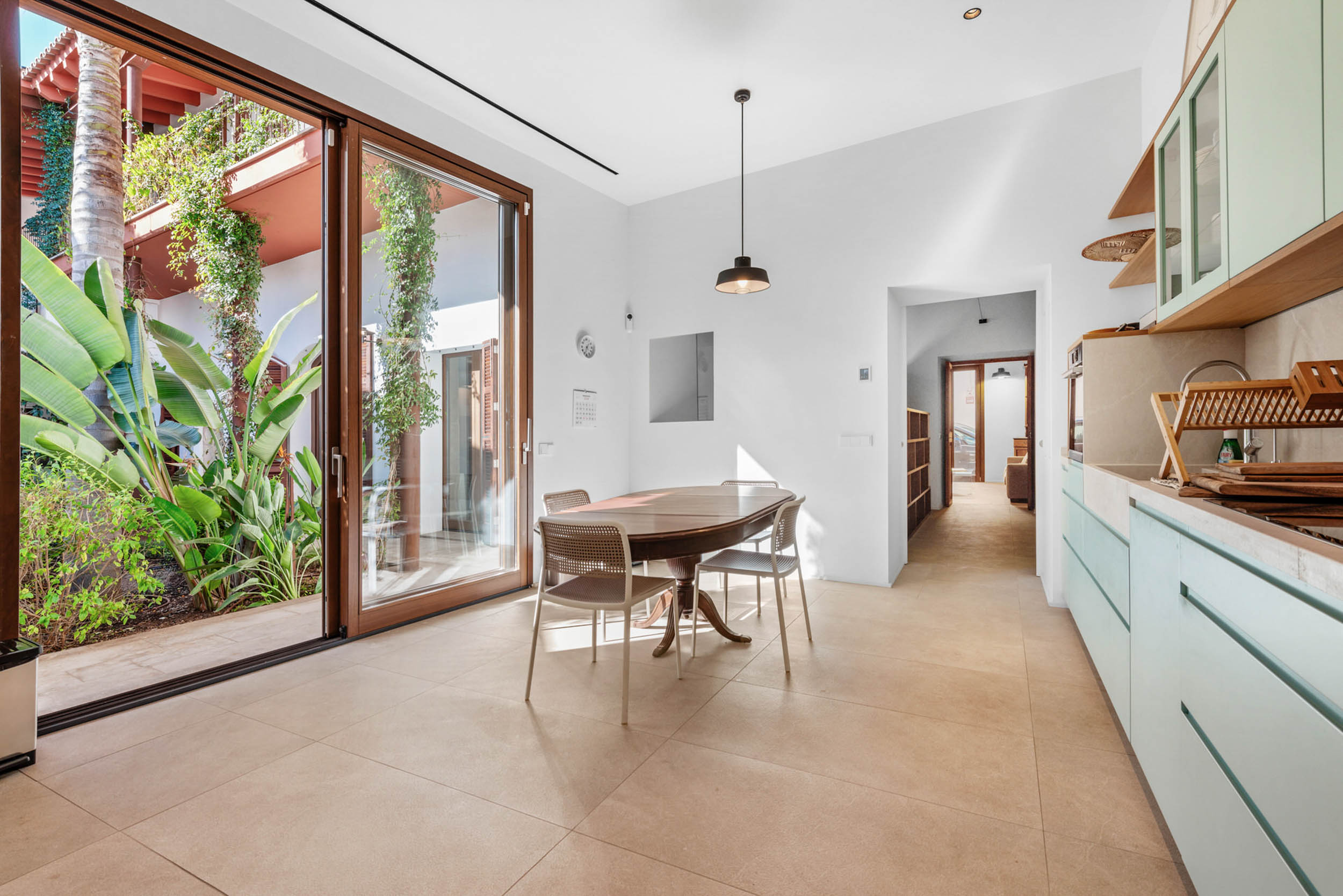 Im Erdgeschoss fügen sich ein vornehmer Wohn- und Essbereich harmonisch zusammen, verbunden durch einen eleganten architektonischen Bogen. Der Gaskamin verleiht dem Ambiente Wärme und Raffinesse, während das beeindruckende Kreuzgewölbe das Ensemble mit einer ausgeprägten mediterranen Identität unterstreicht. Der von natürlichem Licht durchflutete Innenhof wird zum Herzstück des Hauses und sorgt für Weite und ein angenehmes Gefühl der Ruhe.