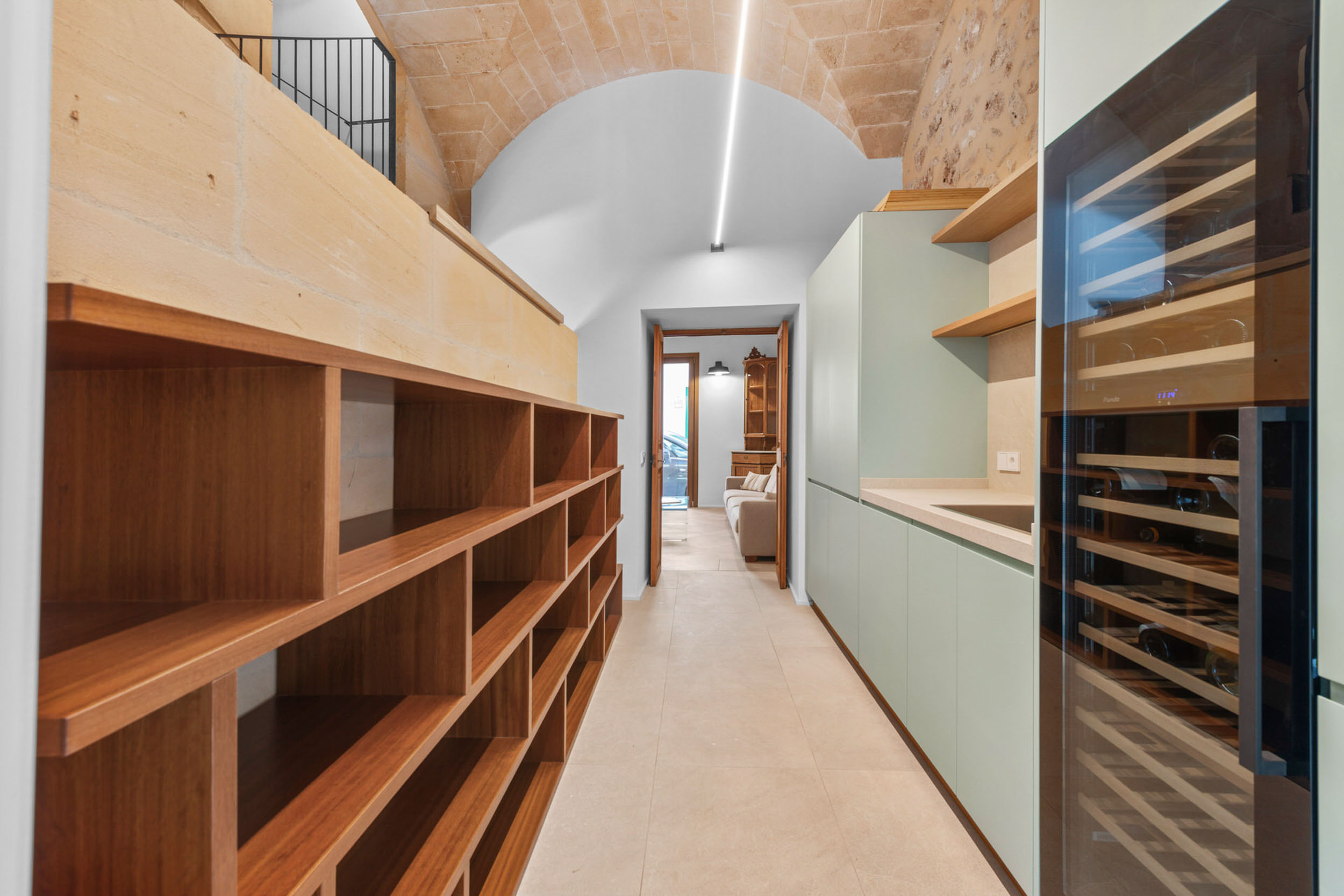 Auf derselben Ebene befindet sich ein großzügiger Raum mit eigenem Bad, der derzeit als Galerie genutzt wird. Dank seiner Vielseitigkeit lässt er sich leicht als privates Büro, Kreativstudio oder sogar als Gewerbefläche nutzen. Die separate Küche mit funktionalem und elegantem Design ist mit einem praktischen Hauswirtschaftsraum verbunden. Unter diesem Bereich befindet sich ein geräumiger Weinkeller, ein besonders attraktives Detail für Liebhaber von Wein und guter Gastronomie.
