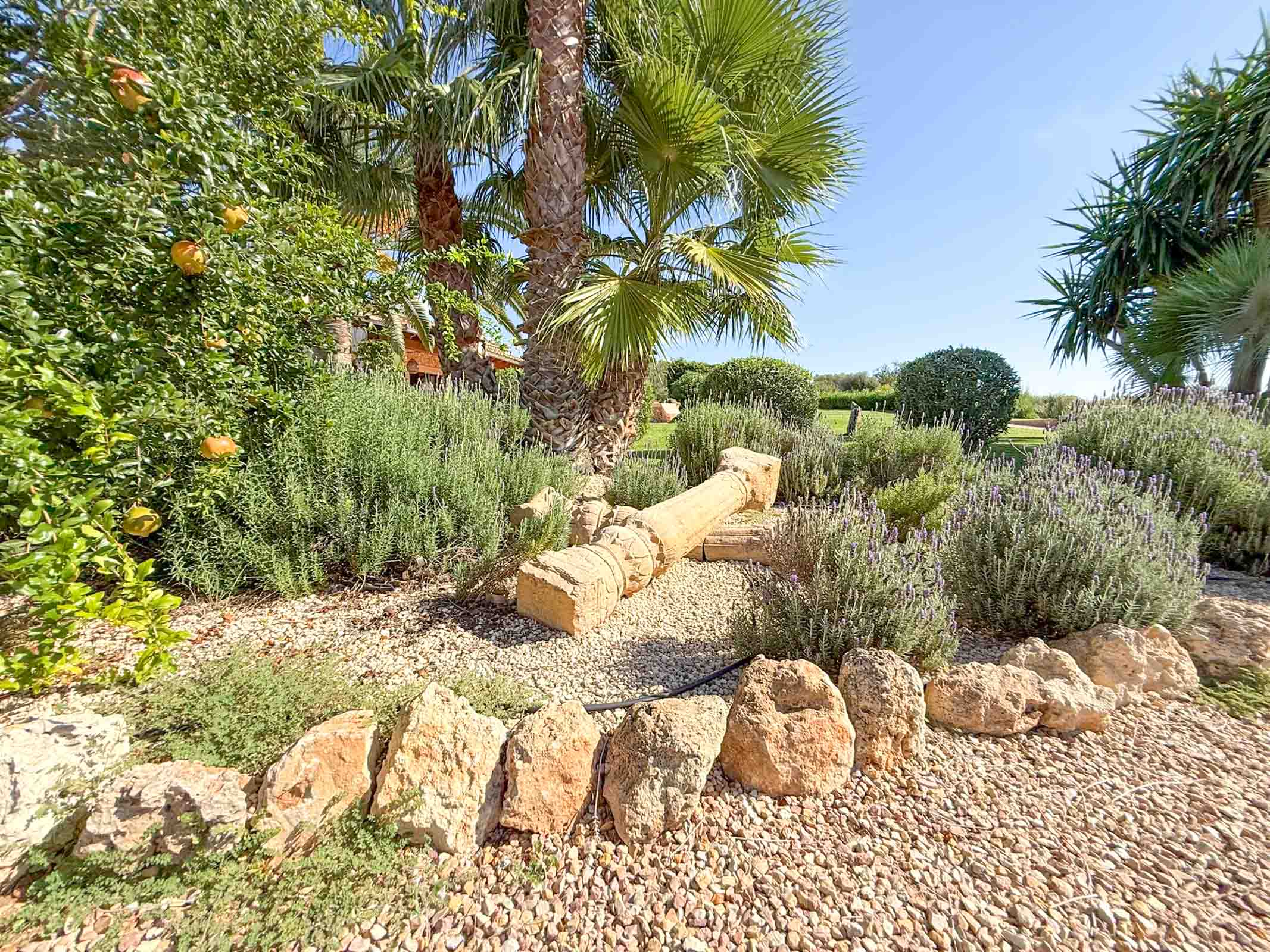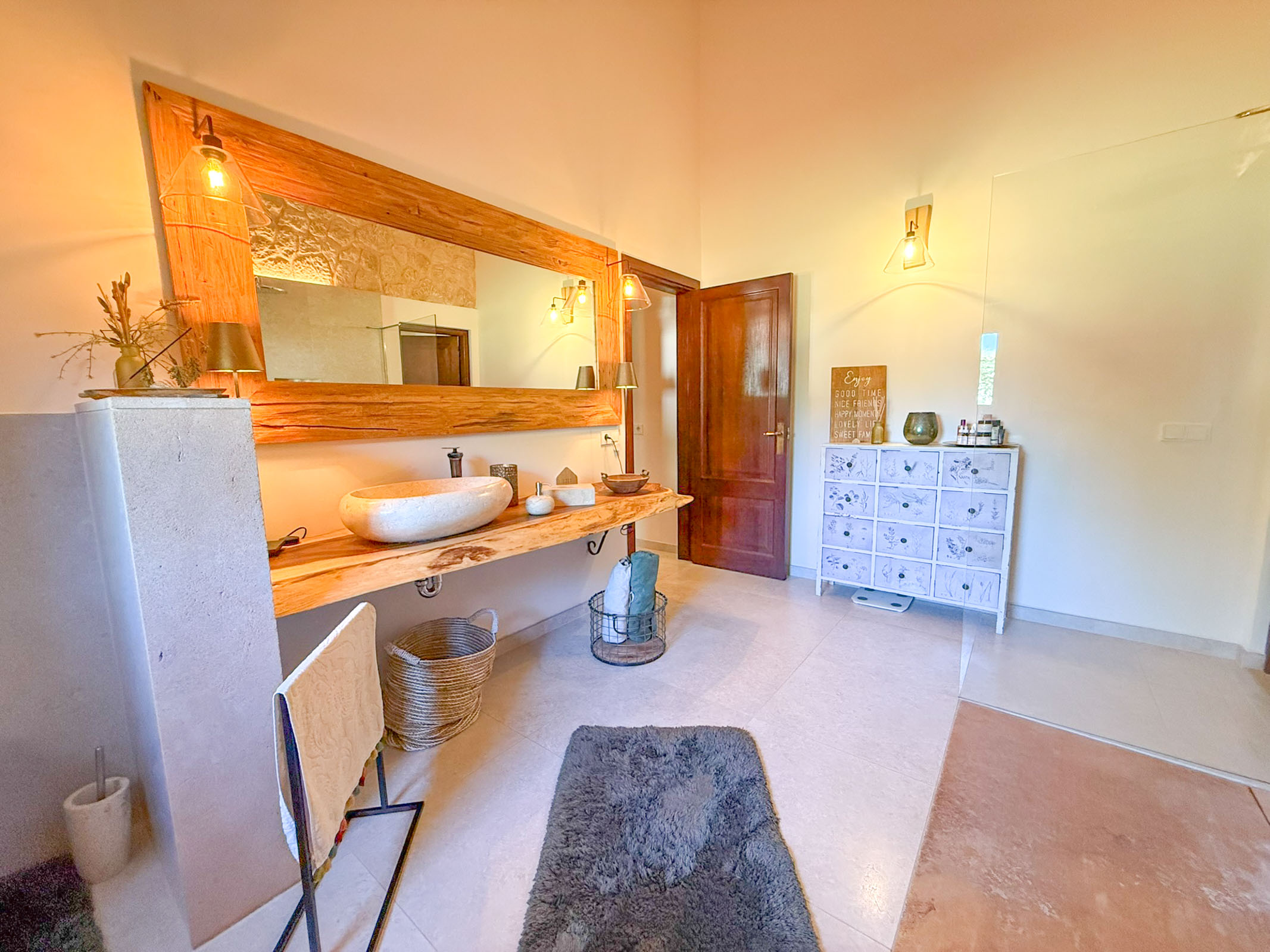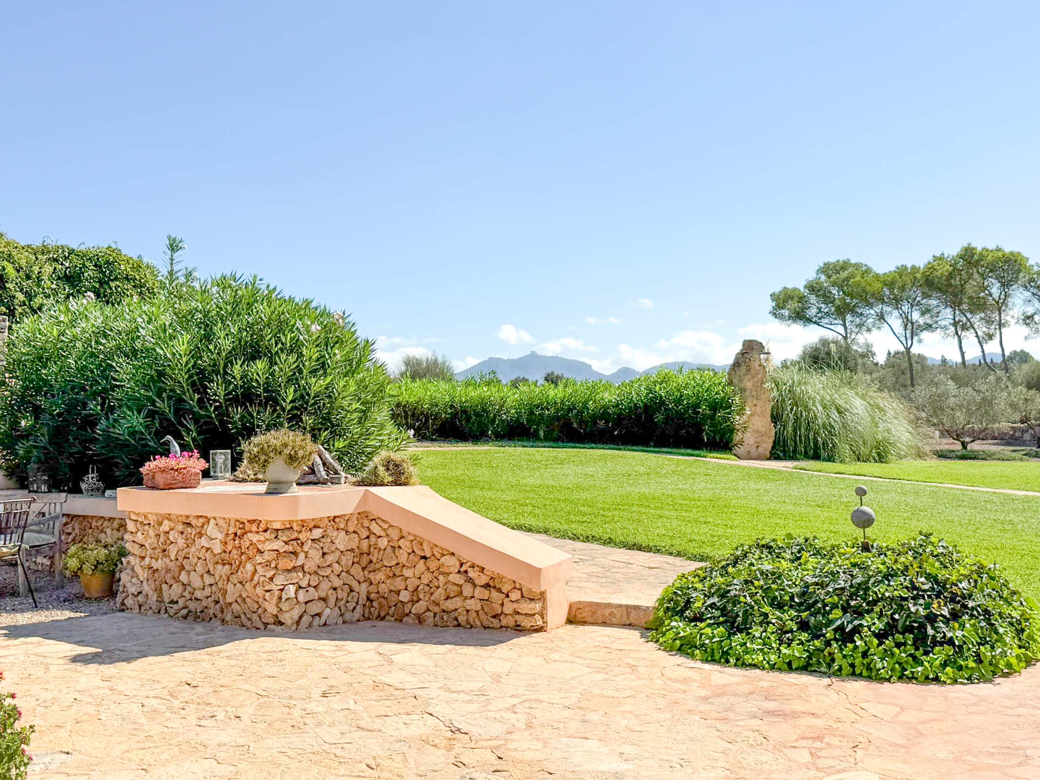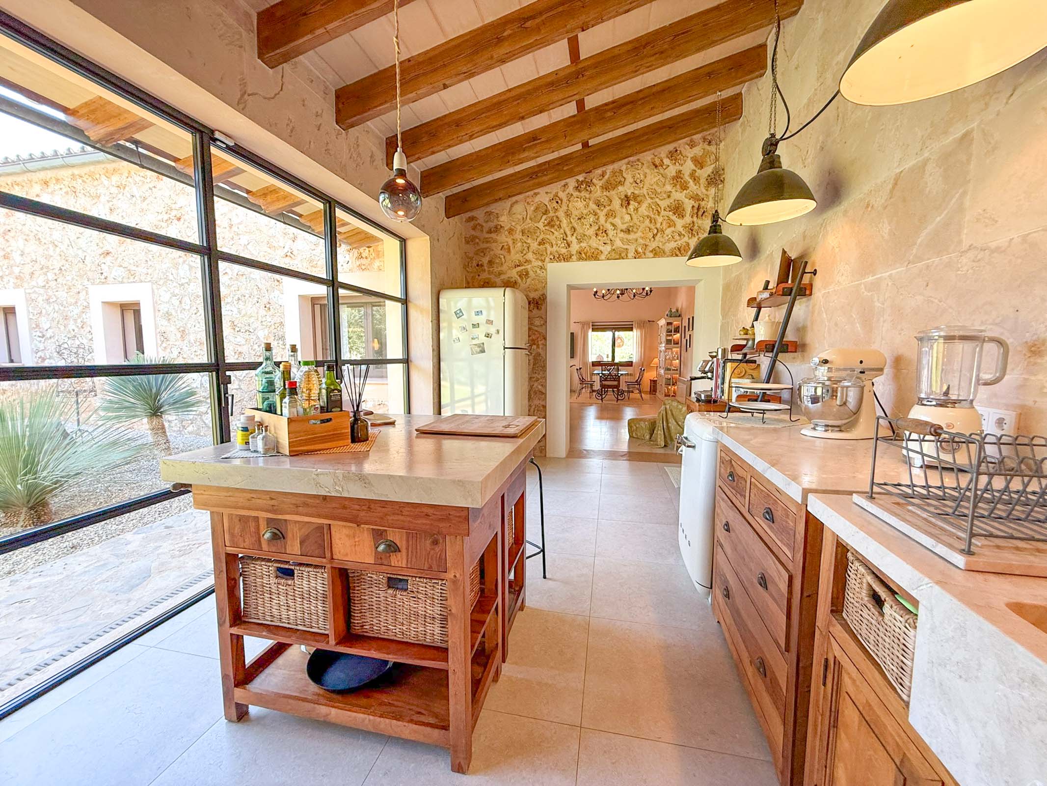 Die liebevoll sanierte Steinfinca erzählt Geschichten vergangener Zeiten, während sie zugleich modernen Komfort auf höchstem Niveau bietet auf 331 m2 purer Wohnfläche. Warme Naturmaterialien, Lichtspiele auf den Steinwänden und der Duft von Holz und mediterranen Pflanzen schaffen eine Atmosphäre, die sofort berührt.